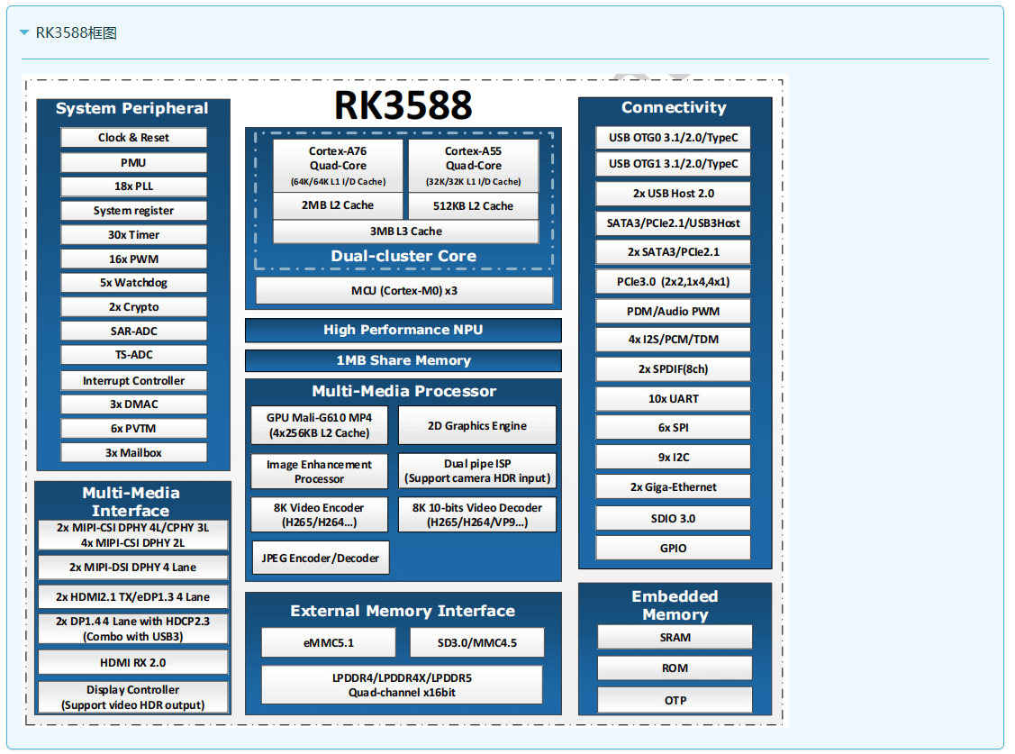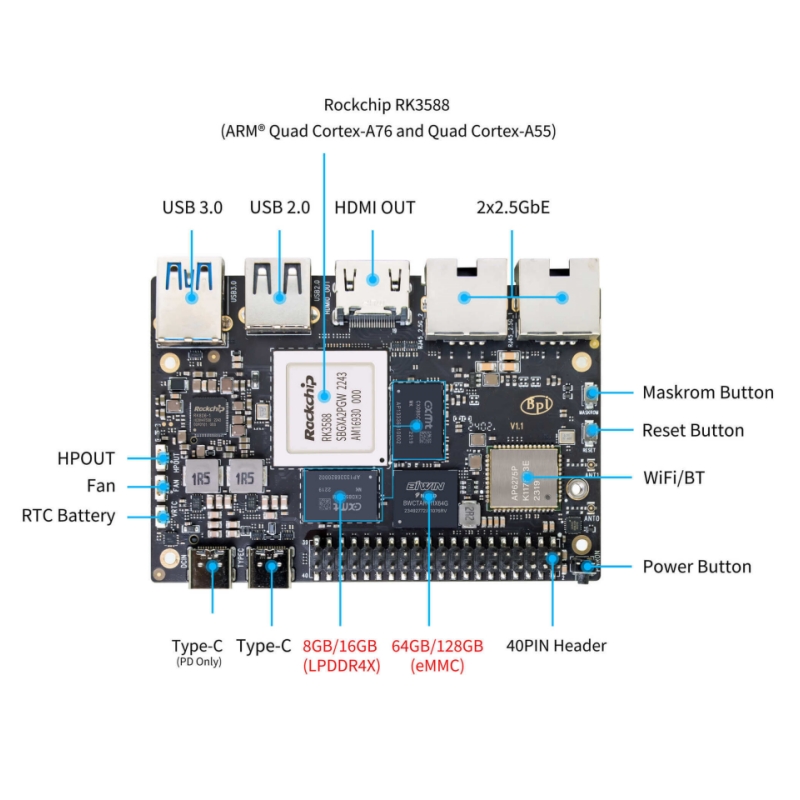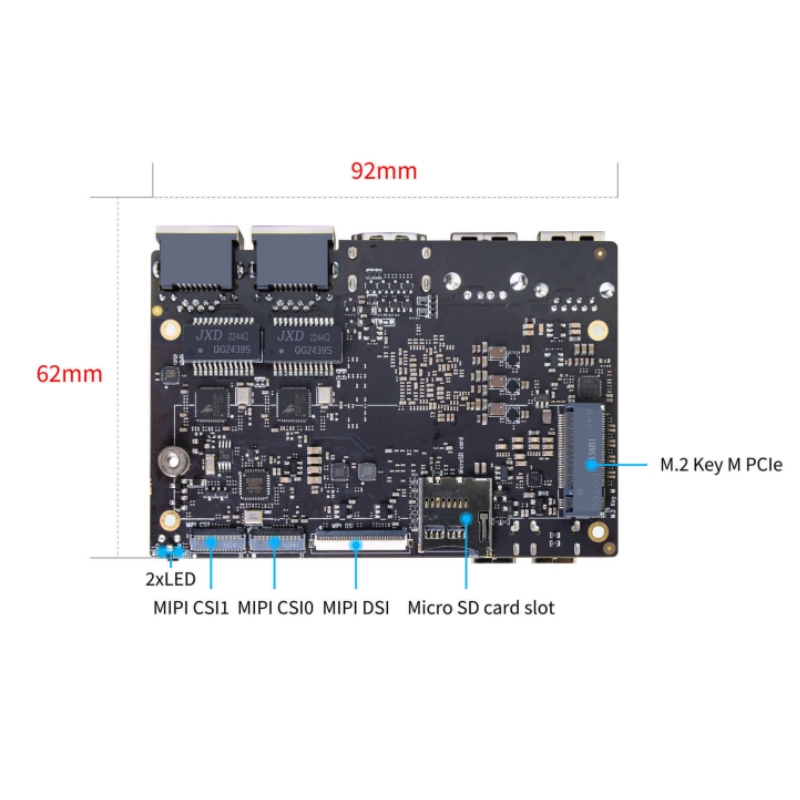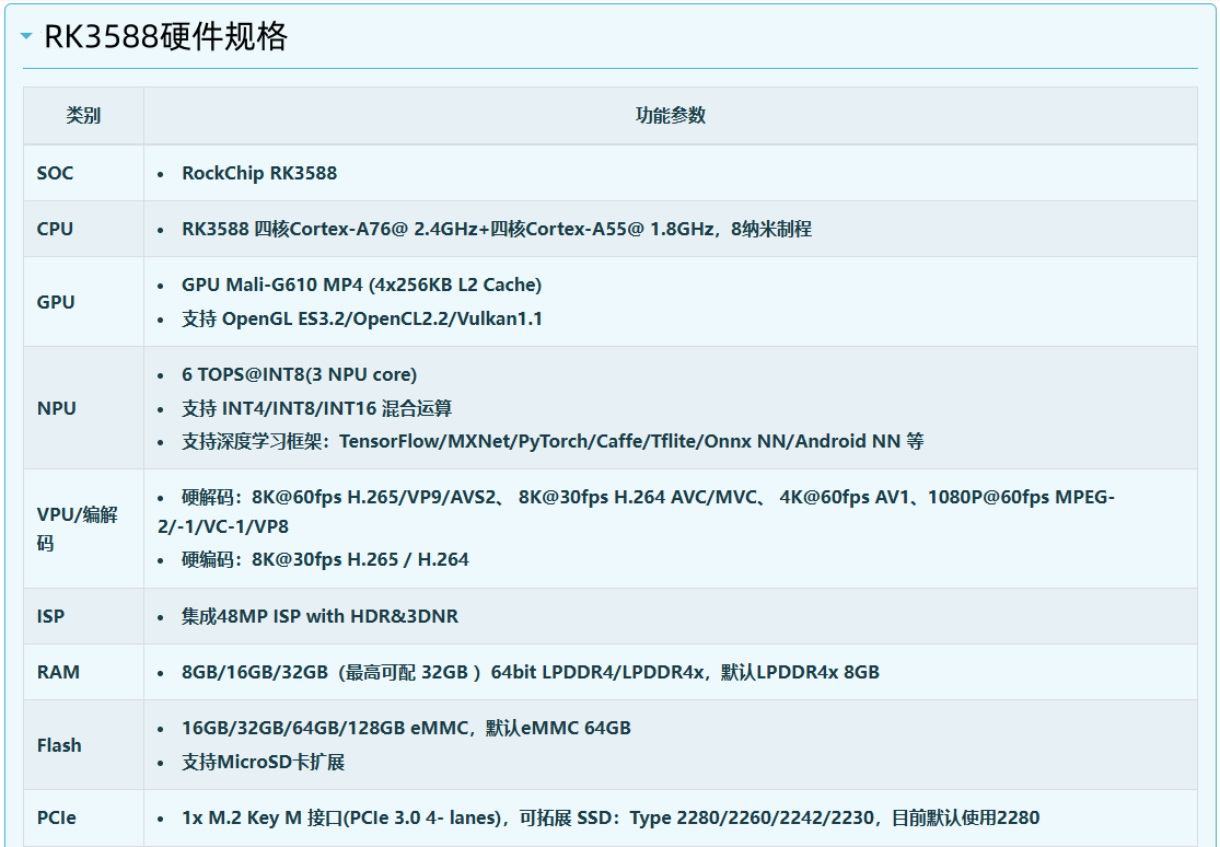 CPU:RK3588 四核Cortex-A76@ 2.4GHz+四核Cortex-A55@ 1.8GHz,8纳米制程